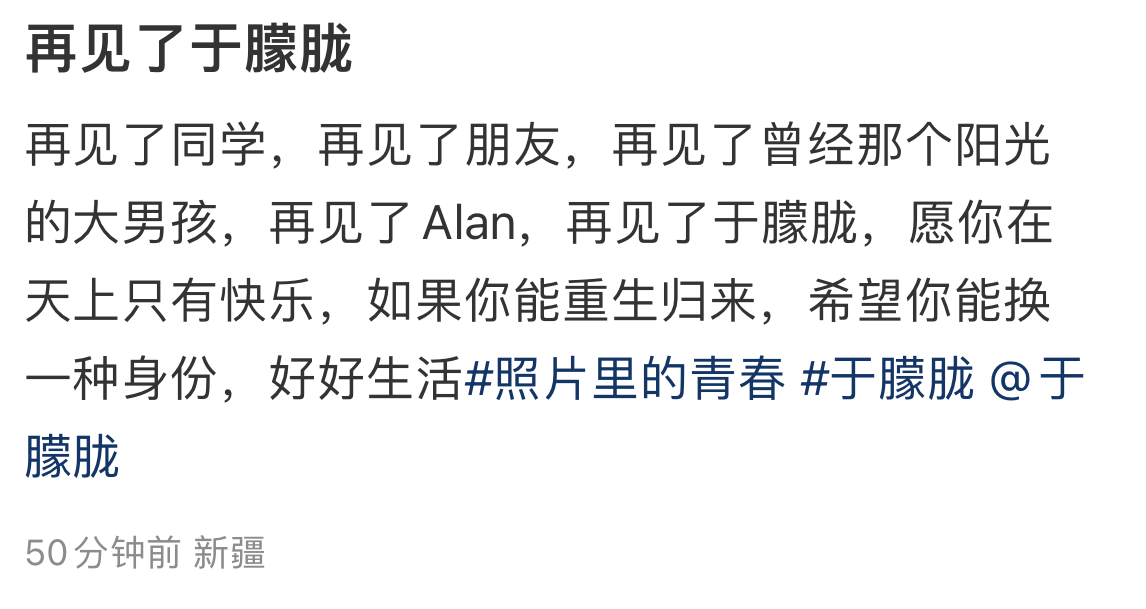 9月11日,于朦胧坠楼身亡,在众星陆续悼念于朦胧后。于朦胧的初中同学也晒出了毕业合影缅怀,他称于朦胧曾是一个阳光的大男孩,希望他重生以后可以换一种身份好好生活。