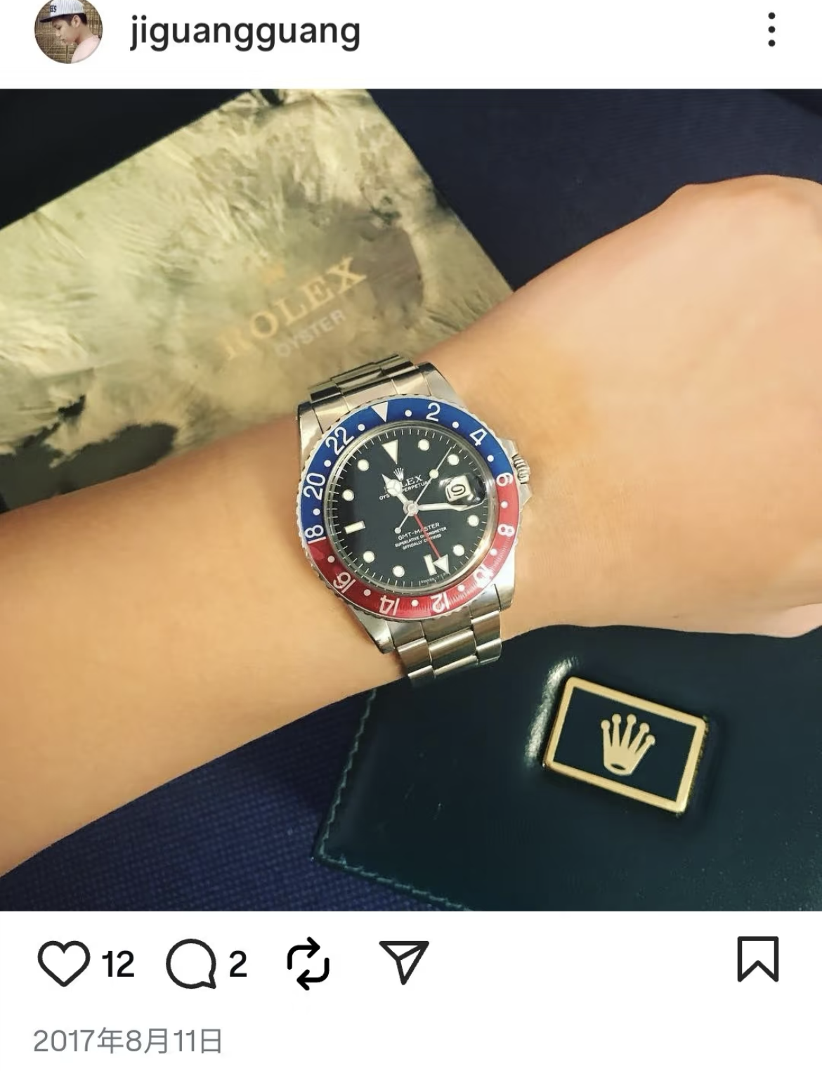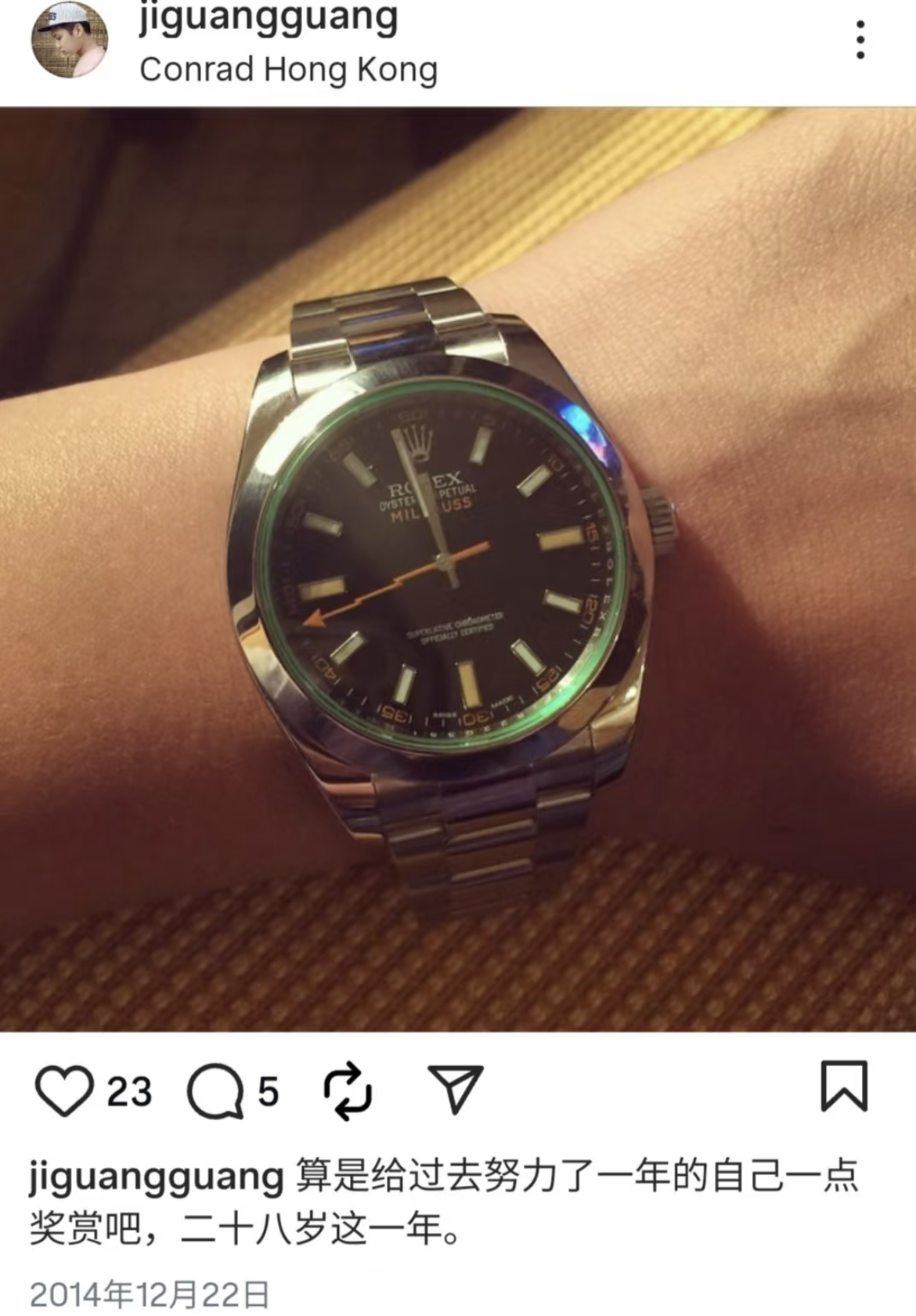 这还没完,网友还发现极光光有多快劳力士手表,早在10年前他就秀出了劳力士手表,称是给自己28岁的生日礼物。之后的几年里,极光光又陆陆续续晒出了新表,很显然是劳力士收藏者。而恰好,娱记曝于朦胧遗体的口袋里也有两块劳力士手表,当然这些信息之后又被编辑掉了。