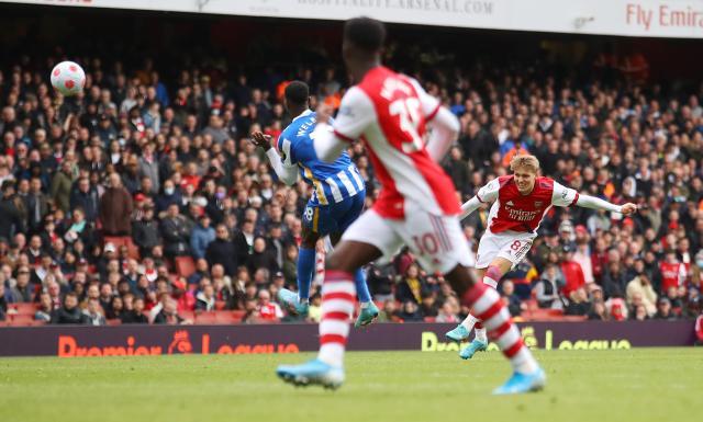 在接下来约一刻钟的时间里,两球落后的阿森纳继续一蹶不振。直到厄德高在终场前不久的直接任意球击中门框,跟上补射的恩凯蒂亚再次将皮球打到门框之上。随后,厄德高在前场抽出了一记石破天惊的世界波,皮球碰到韦尔贝克身上出现折射,直接贴着横梁飞进了球门左上方死角。伤停补时的6分钟里,阿森纳发动猛攻,先是恩凯蒂亚的头球攻门被桑切斯惊险托出横梁,随后加布里埃尔也利用角球机会近距离头球攻门,但皮球打到了库库雷利亚身上弹出底线。最终在全场球迷的鼓噪声中,阿森纳吞下了1比2不敌布莱顿的结果。